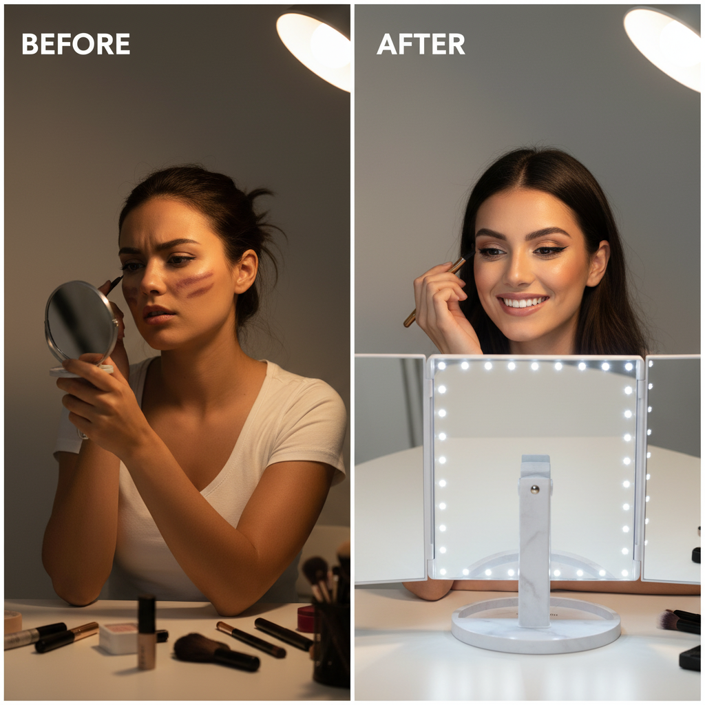 Three mirrors, adjustable angles, and dimmable LEDs for flawless application